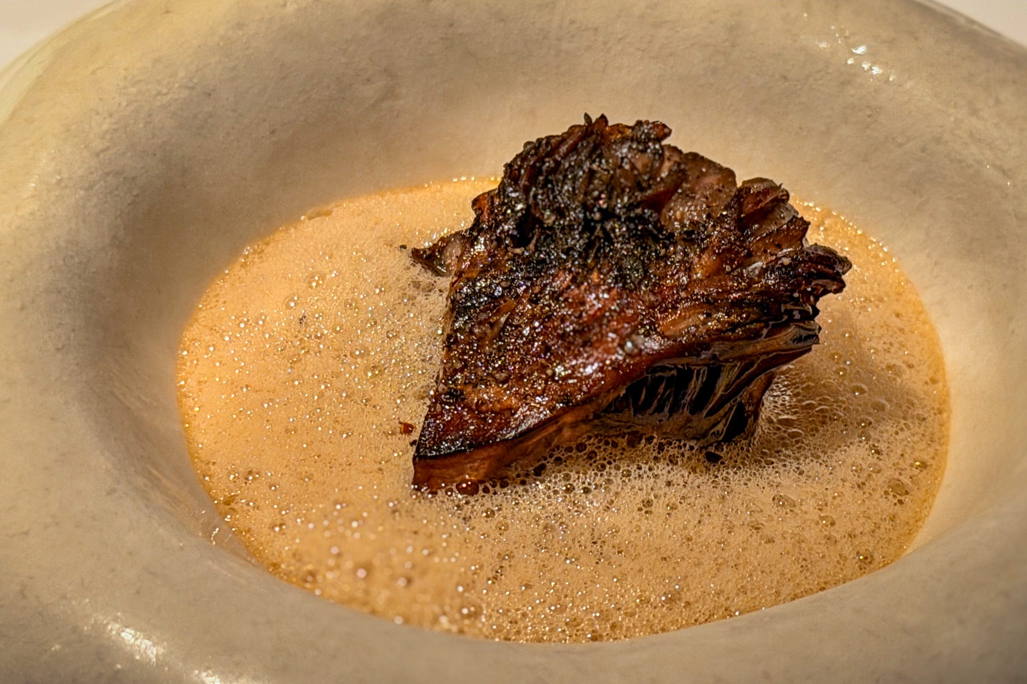 A slab of grilled maitake, served with a marmalade of ceps and smoked pig’s ear, tucked into a foam of beer and yeast, is both luxurious and resolutely earthy.