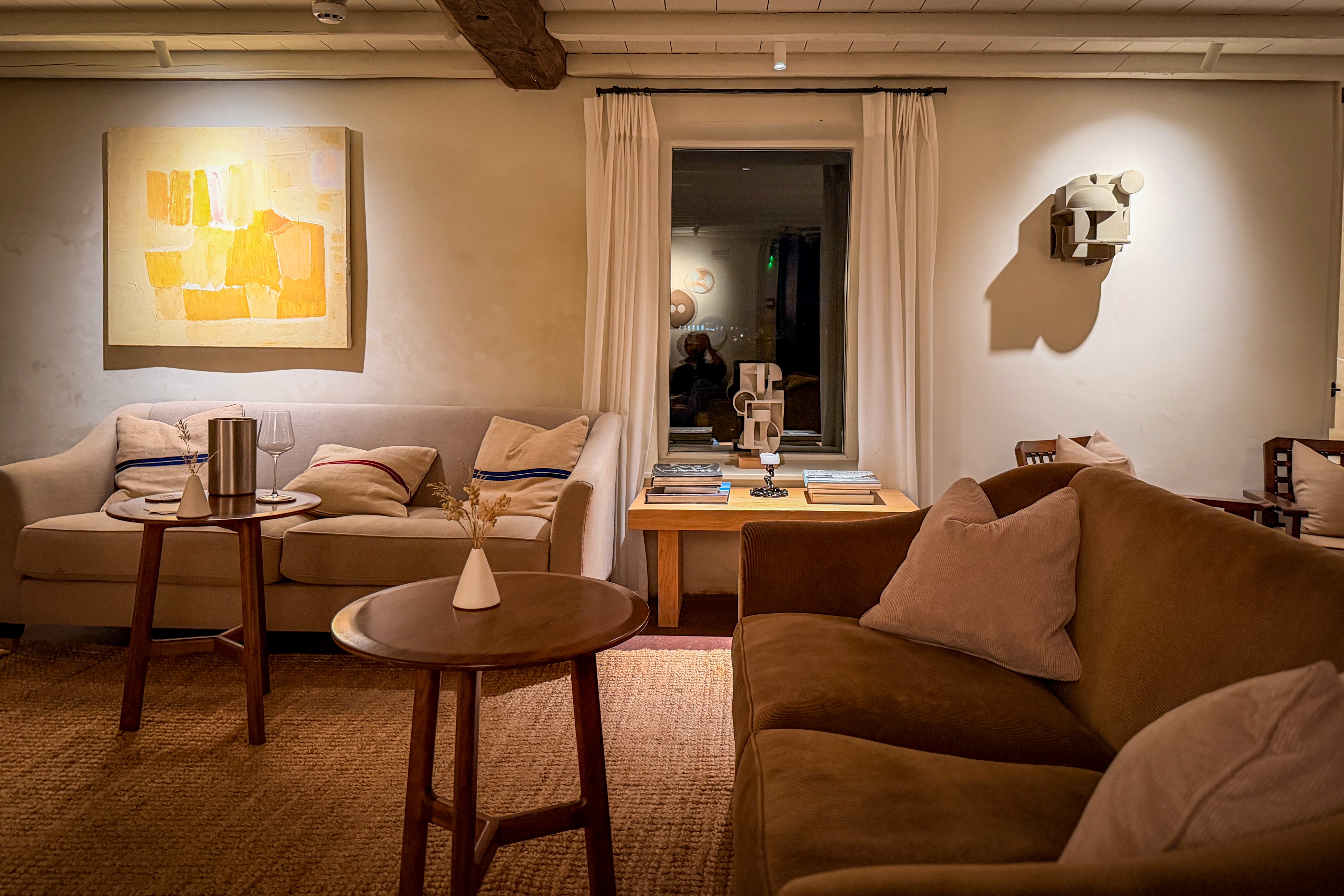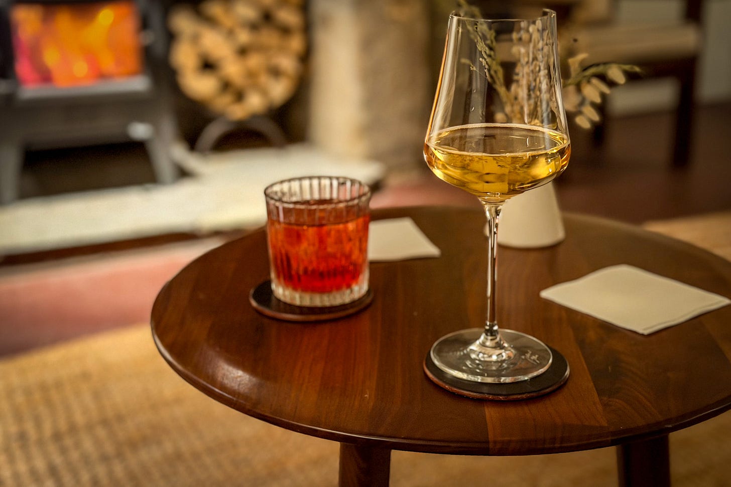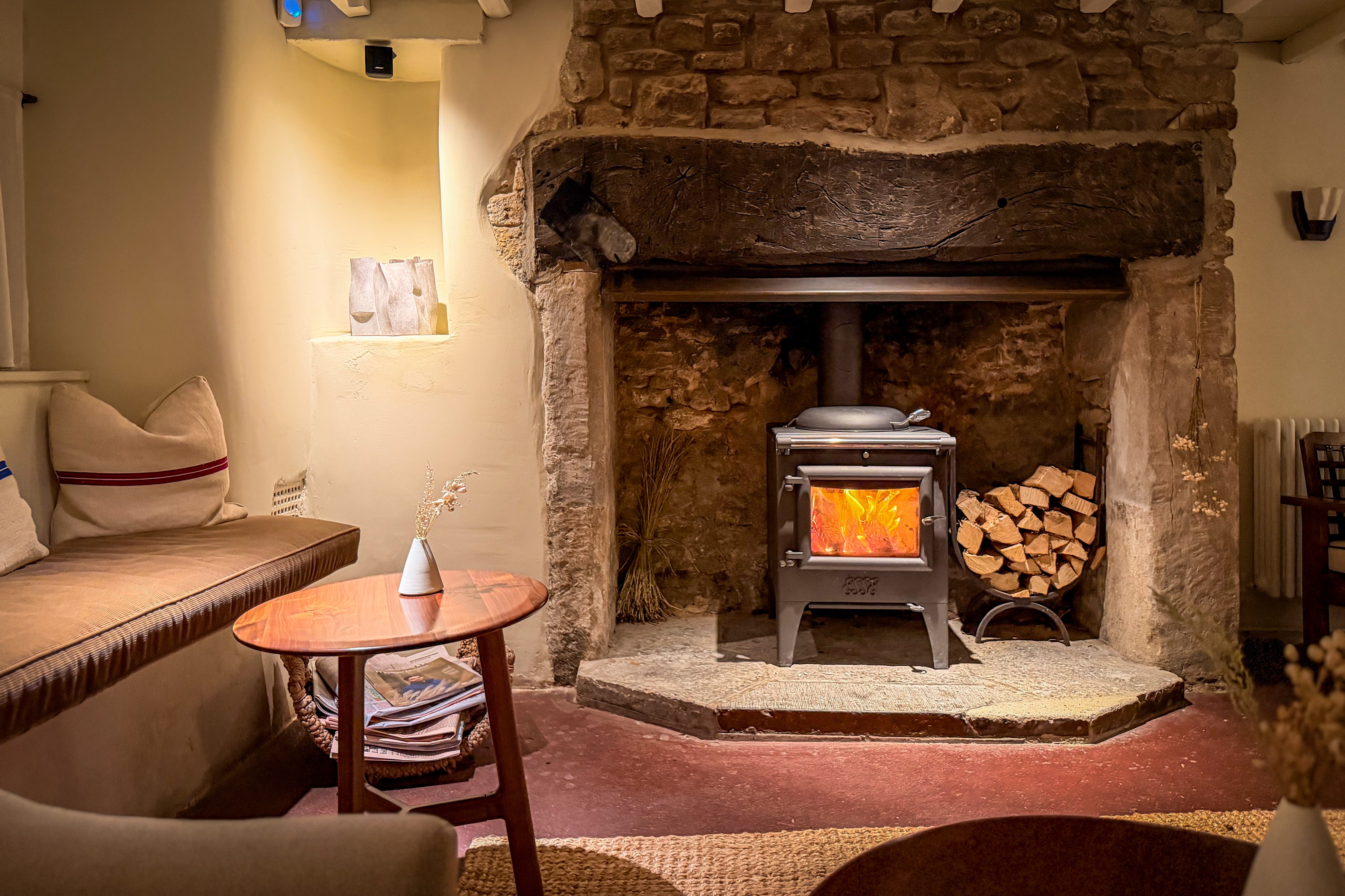 There is a short pile of newspapers in a basket; both the logs and decorative pillows are hand-chopped, the latter as if by protocol. It all looks thrown together in that deeply considered, designer way. An indoor fire exudes warmth and a flickering glow that softly whispers, “Stay a while, drink red wine and throw on some thick socks.”